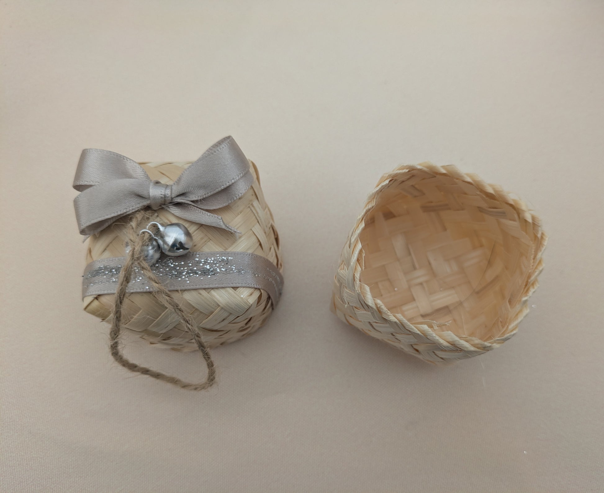 Decorated by hand using recycled plastic bottle ribbon and eco friendly glitter these bamboo boxes will make the ideal Christmas tree secret gift.
